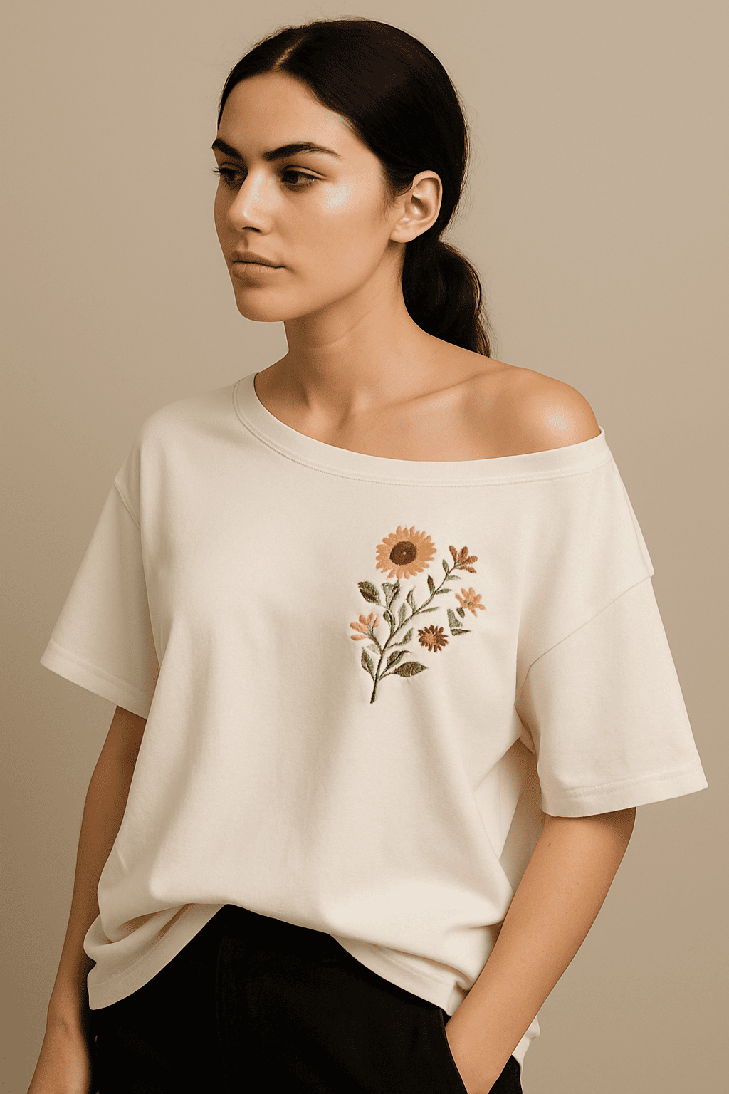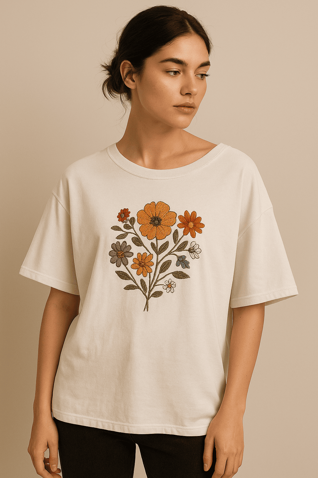 This oversized embroidered T-shirt is made from a soft cotton-blend fabric for maximum comfort. The front features a delicate floral embroidery motif, while the back showcases a stylish “GOOD VIBES” embroidered text.